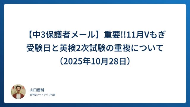【中3保護者メール】重要!!11月Vもぎ受験日と英検2次試験の重複について(2025年10月28日) 2025.10.28 中3保護者メール Yamada Yusuke 進学塾リードアップ塾生専用サイト