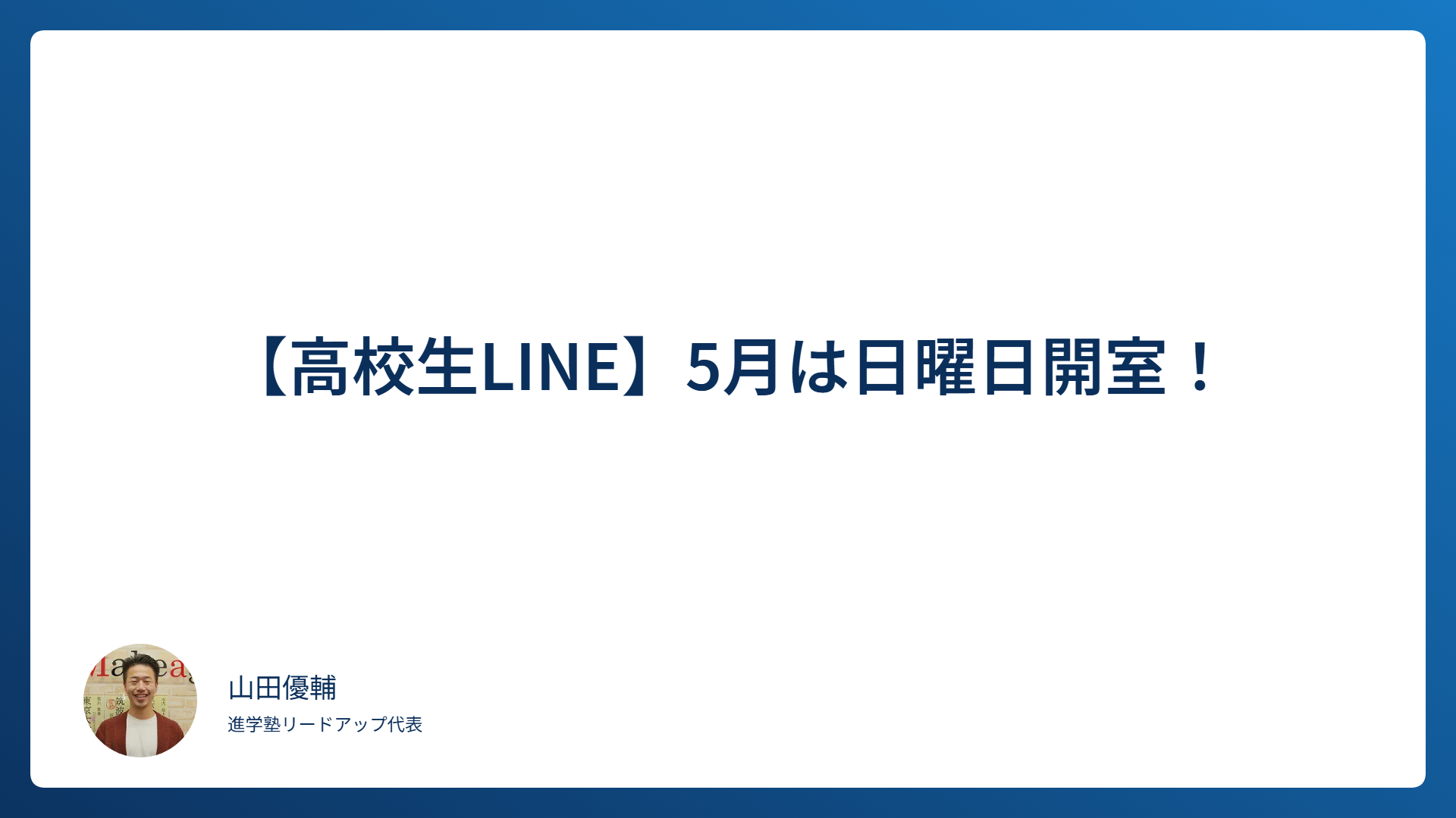 2025.05.03 2025.05.07 高校生 【高校生LINE】5月は日曜日開室! Yamada Yusuke この情報へのアクセスはメンバーに限定されています。ログインしてください。メンバー登録は下記リンクをクリックしてください。既存ユーザのログインユーザー名またはメールアドレスパスワードボットではないことを証明してください9 + 4 = ログイン状態を保存する パスワードを忘れた場合 パスワードリセットはじめての方はこちら 新規ユーザー登録 ABOUT ME 山田優輔進学塾リードアップ代表XFacebookInstagramLINE真砂生まれ・真砂育ち。稲毛高校出身。 高校では県3位のラグビー部主将を務めながら学年トップの成績を維持。指定校推薦で中央大学理工学部に進学。 大学でもGPA3.0越えで大学院への推薦を取得(GPA=大学の成績)。 主に「中3生(高校受験)」「高校生(理系)の大学受験」を担当。