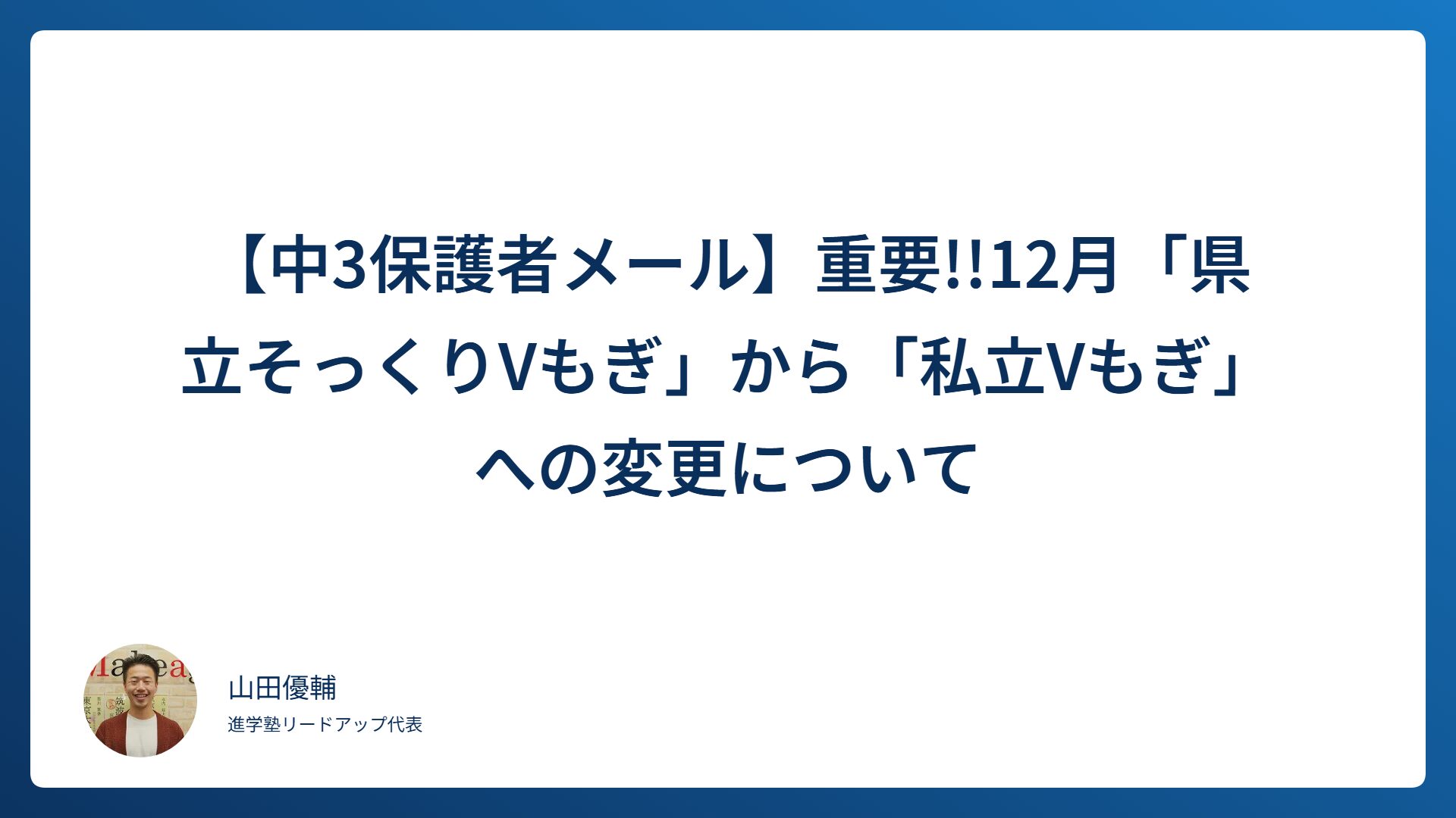 2025.10.20 中3保護者メール 【中3保護者メール】重要!!12月「県立そっくりVもぎ」から「私立Vもぎ」への変更について(2025年度) Yamada Yusuke この情報へのアクセスはメンバーに限定されています。ログインしてください。メンバー登録は下記リンクをクリックしてください。既存ユーザのログインユーザー名またはメールアドレスパスワード ログイン状態を保存する パスワードを忘れた場合 パスワードリセットはじめての方はこちら 新規ユーザー登録 #Vもぎ ABOUT ME 山田優輔進学塾リードアップ代表XFacebookInstagramLINE真砂生まれ・真砂育ち。稲毛高校出身。 高校では県3位のラグビー部主将を務めながら学年トップの成績を維持。指定校推薦で中央大学理工学部に進学。 大学でもGPA3.0越えで大学院への推薦を取得(GPA=大学の成績)。 主に「中3生(高校受験)」「高校生(理系)の大学受験」を担当。